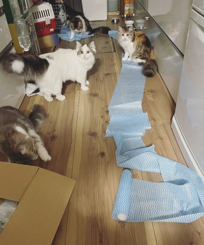 赤ちゃんなのでおしっこもうんちもトイレ以外の所でしてしまいます。赤ちゃん1人2人のおしっこ&うんちなら、大したことないんですが、それが6猫ともなると…ゾッとします(>_<)💦💦